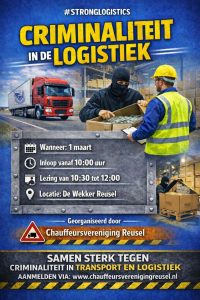 Meld je aan voor de lezing over criminaliteit in transport en logistiek. Deze lezing wordt verzorgd door het PVO, dat samen met de politie, douane en de transportsector de campagne #StrongLogistics heeft opgezet. Tijdens de bijeenkomst krijg je inzicht in risico’s én hoe we samen de sector weerbaarder kunnen maken.